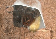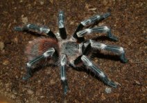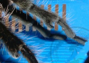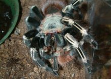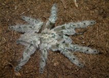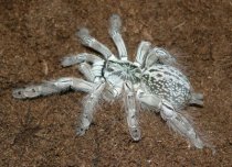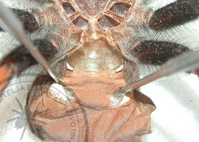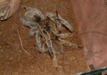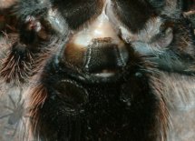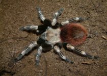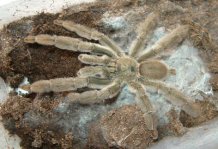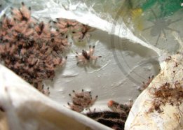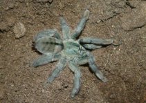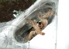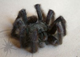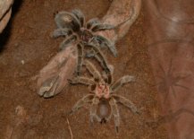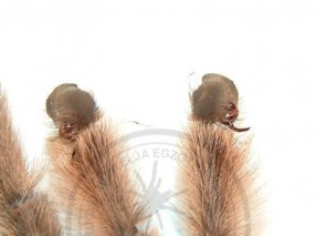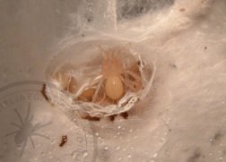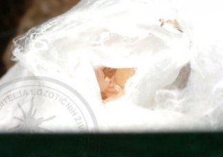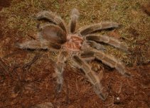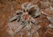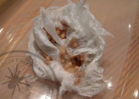 Brachypelma vagans, nekoliko minuta nakon polijeganja jaja. Nije uspjela složiti kokon, vjerojatno zbog glatke plastike (plastični karnister) koju je imala kao skrovište u terariju,sa koje nije uspjela zamotati mrežu.