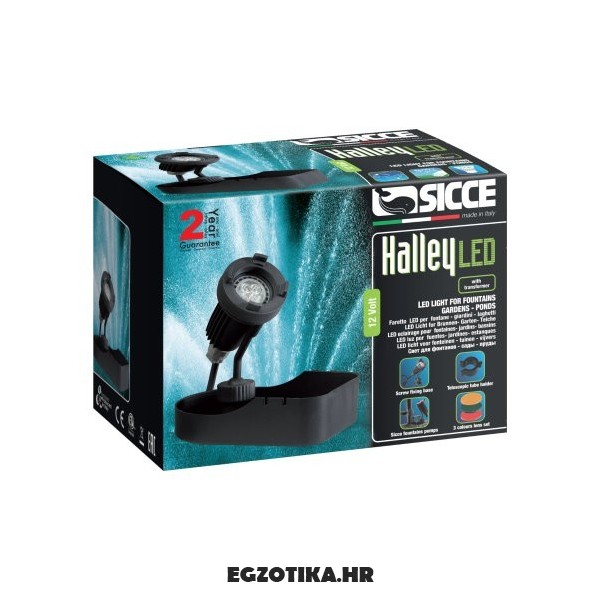 Ultra svjetla LED rasvjeta za vanjsku upotrebu, stvara kreativne i jake podvodne i površinske svjetlosne efekte. Pogodna za vrtna jezera, fontane i vrtove, može se potopiti u vodu. Halley LED rasvjetu idealno je koristiti u kombinaciji s Aqua 3 ili Syncra Pond pumpama zahvaljujući kuki pomoću koje se može pričvrstiti na teleskopsku cijev ili izravno na kučište filtra. Jednostavna i brza instalacija, "plug & play" način rada. Niske razine potrošnje energije; bez UV i IR emisija zračenja, žarulja ne sadrži živu. Izrađena u skladu s propisima o sigurnosti. Rasvjeta se nalazi na postolju za lakše i stabilnije pozicioniranje. Rotirajući nosači kojim je moguće usmjeravanje za 360°.