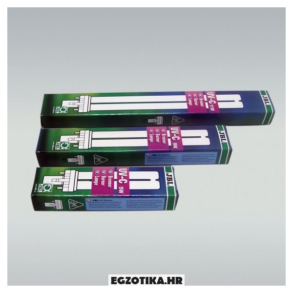 JBL JBL REPLACEMENT LAMP UV-C Visokokvalitetna zamjenska UV-C lampa za AquaCristal UV-C i ostale UV-C uređaje. Modeli od 18, 24, 36 i 55 W opremljeni 2G11 priključkom. Modeli od 5, 9 i 11 W opremljeni G23 priključkom. Nikada ne dirajte UV-C lampu golim rukama jer se smanjuje vijek trajanja. Upozorenje: UV-C zrake mogu uzrokovati oštećenja kože i očiju. Serija i snaga otisnuti na pakiranju.Proizvođač: JBL GmbH & Co. KG Dieselstr.3, D-67141 Neuhofen, Njemačka Zemlja podrijetla: Njemačka.